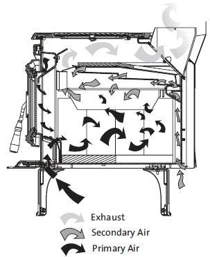 Primary Air is drawn into a front inlet in the stove bottom and directed through a