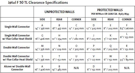 The Jøtul F 50 TL can be installed in an alcove as diagrammed in below drawings.