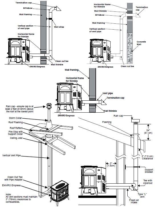 Five of the most typical pellet venting methods are illustrated below, refer to product