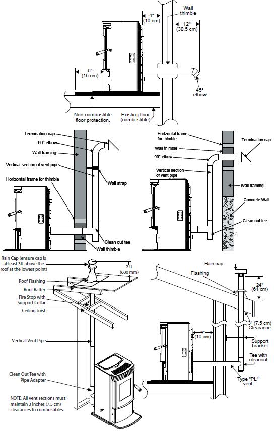 Five of the most typical pellet venting methods are illustrated below, refer to product