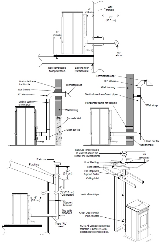 Five of the most typical pellet venting methods are illustrated below, refer to product