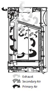 Primary Air is drawn into a front inlet in the stove bottom and directed through a