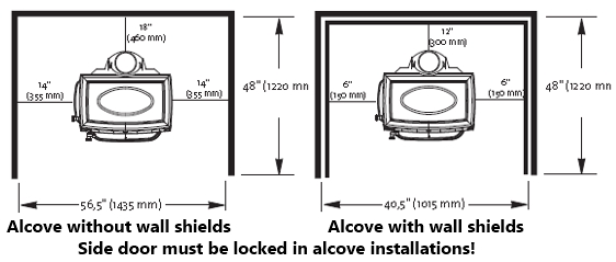 The Jøtul F 500 Oslo can be installed in an alcove as diagrammed in below drawings.