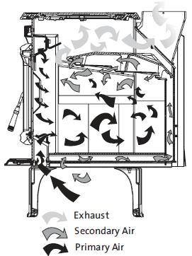 Primary Air is drawn into a front inlet in the stove bottom and directed through a
