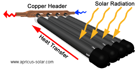 The operation of the AP solar collector is very simple. 1. Solar Absorption: Solar radiation is absorbed by the solar tubes and converted into heat. 2. Solar Heat Transfer: Heat pipes conduct the heat from within the solar tube up to the header pipe. 3. Solar Energy Storage: Water is circulated through the header, via intermittent pump cycling. Each time the water circulates through the header the temperatures is raised by 5-10oC / 9-18oF. Throughout the day, the water in the storage tank is gradually heated. |